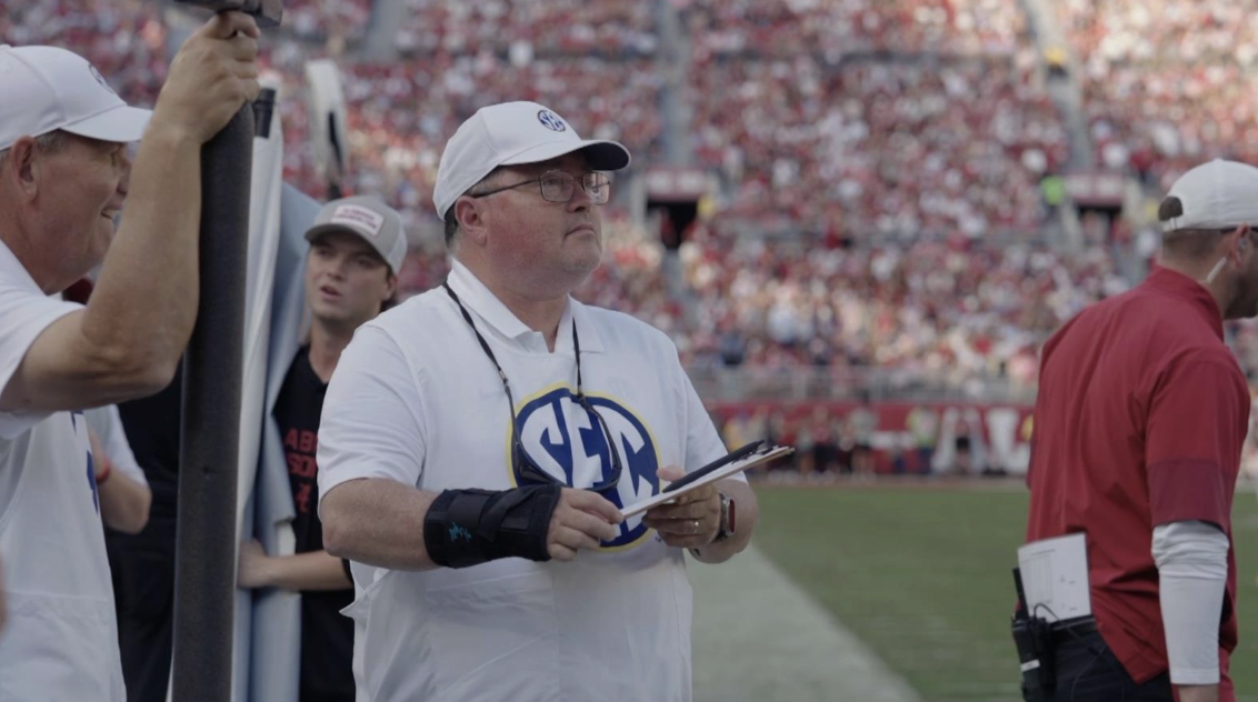 I just kept backing up, and I bumped into something or somebody, said Kirby Michaels, an SEC sideline official whose job is to document penalty flags at Alabama games.